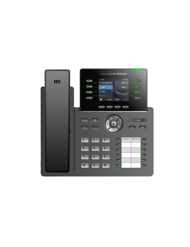Part of the GRP series of Carrier-Grade IP Phones, the GRP2634 is a professional 8-line model designed with zero-touch provisioning for mass deployment and easy management. It features a sleek design and a suite of next-generation features including: 5-way voice conferencing to maximize productivity, integrated PoE & Wi-Fi, full HD audio on both the speaker and handset to allow users to communicate with the utmost clarity, EHS support for Plantronics headsets and USB to support Grandstream’s GUV Series Headsets.
